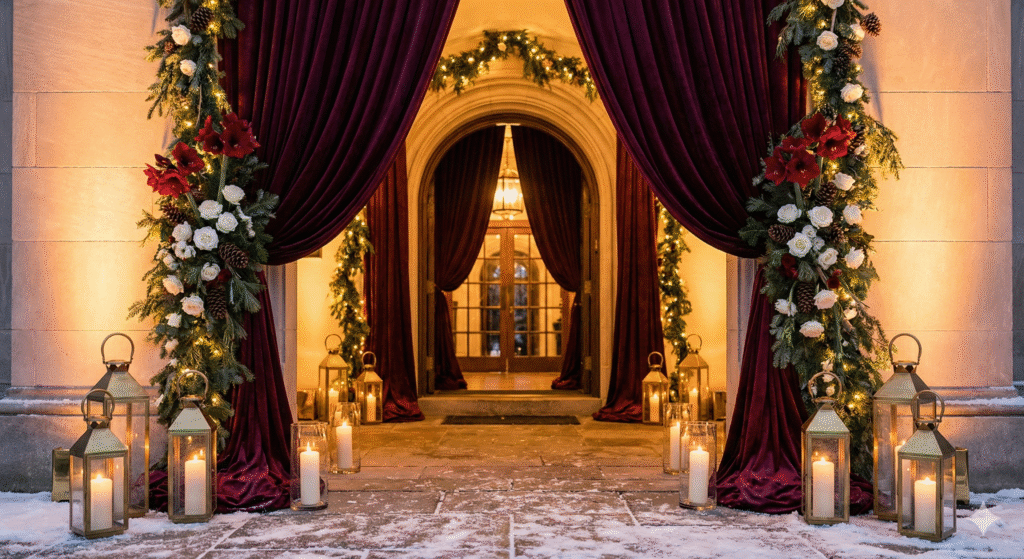 1. مدخل القاعة: ستائر مخملية بلون عميق مع إضاءة ذهبية ترحب بالضيوف.
