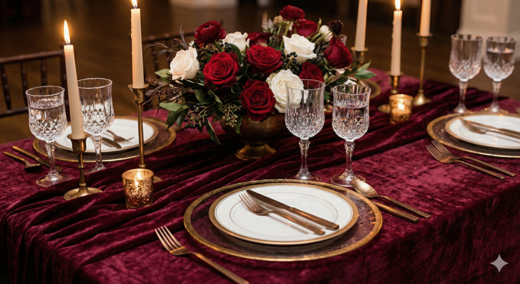 2. طاولات الطعام: مفارش مخملية مع أطباق ذهبية أو برونزية، وزهور متناسقة.