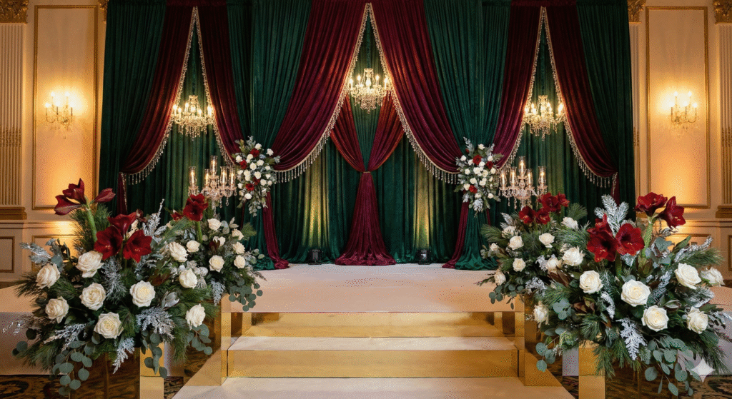 4. منصة العروسين: خلفية مخملية مزينة بالكريستال أو الزهور، لتكون مركز الحفل.