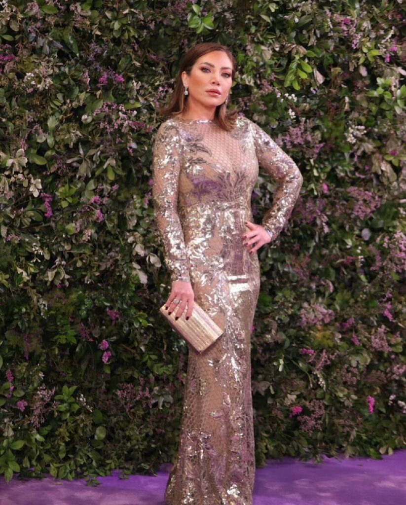 بأناقة الـ Royal Presence، أطلت سلافة معمار لتخطف الأنفاس بفستان من الدانتيل والتول الشفاف باللون Antique Gold. تميز الفستان بتطريزات يدوية مكثفة بنقوش نباتية كلاسيكية،وقصّة مستقيمة تنساب على الجسم برقي مما جعلها تبدو كـ “تمثال من الذهب”. الكلتش الذهبي أضاف لمسة luxury accent، أما شعرها فكان مفرودًا بأمواج ناعمة، ومكياجها ارتكز على glowy skin وbold eyeliner، ليعكس شخصيتها الفنية القويةافكانت عنواناً للرقي والجمال الهادئ.