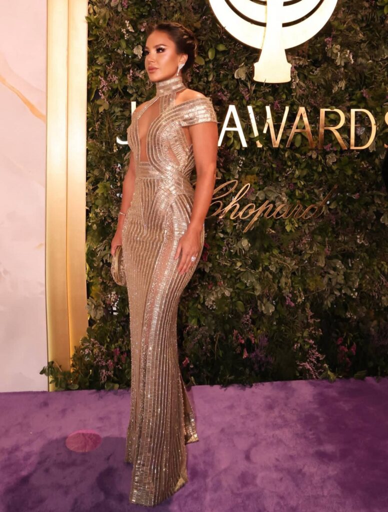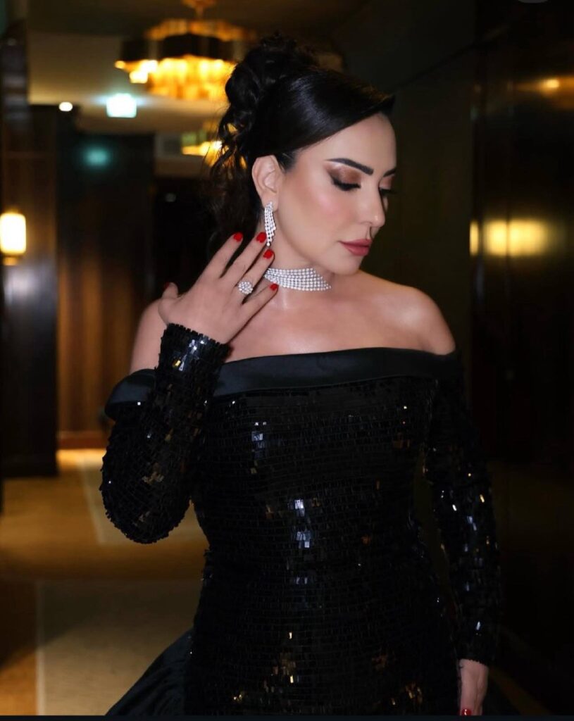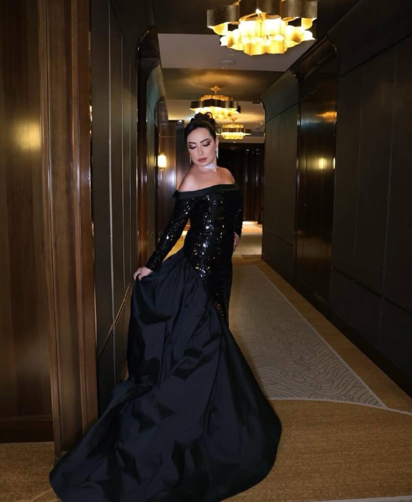 أصالة اختارت فستانًا أسود بتفاصيل لامعة، يجمع بين statement couture وstage charisma. شعرها كان مرفوعًا بأسلوب عصري، والمكياج ارتكز على defined brows وbronzed glow، ليعكس حضورها القوي كنجمة الحفل.