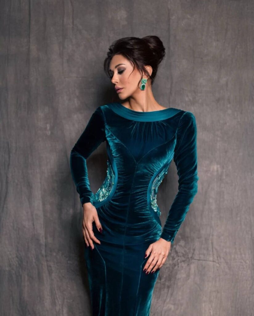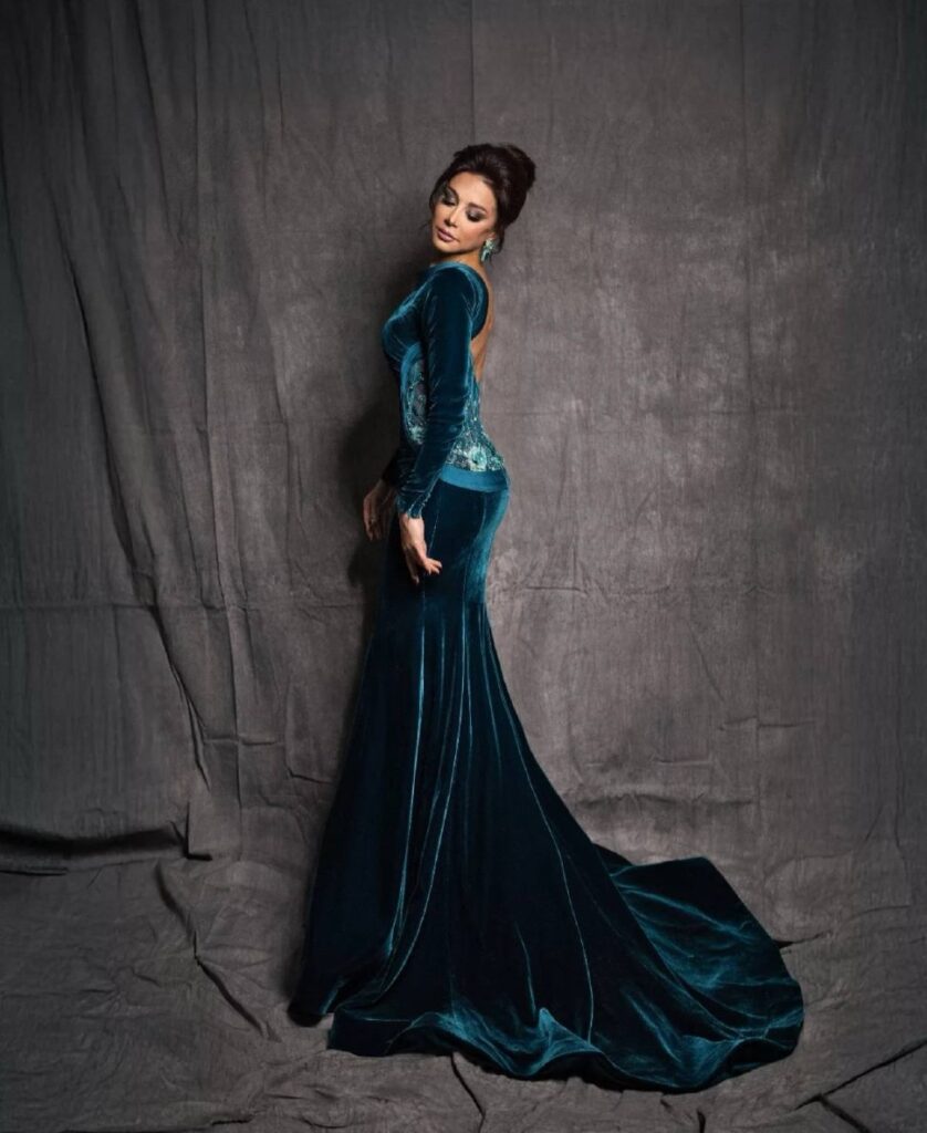افتتحت النجمة كاريس بشار حضورها بإطلالة تفيض بالكبرياء. اختارت كاريس فستاناً من المخمل الفاخر بلون Deep Teal، بقصة الـ Mermaid Silhouette التي نحتت قوامها ببراعة. التداخل بين المخمل والدانتيل الشفاف عند الظهر منحها إطلالة الـ Sultry Elegance (الأناقة الجذابة) التي لا تخدش الوقار، التصميم جمع بين structured elegance وsoft femininity