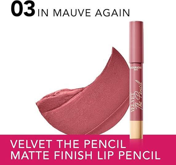 أحمر شفاه Bourjois Velvet The Pencil – 03 Mauve Again يمنحك لونًا غنيًا بلمسة مطفية مخملية تدوم طوال اليوم، مع تصميم عملي على شكل قلم لسهولة الاستخدام.