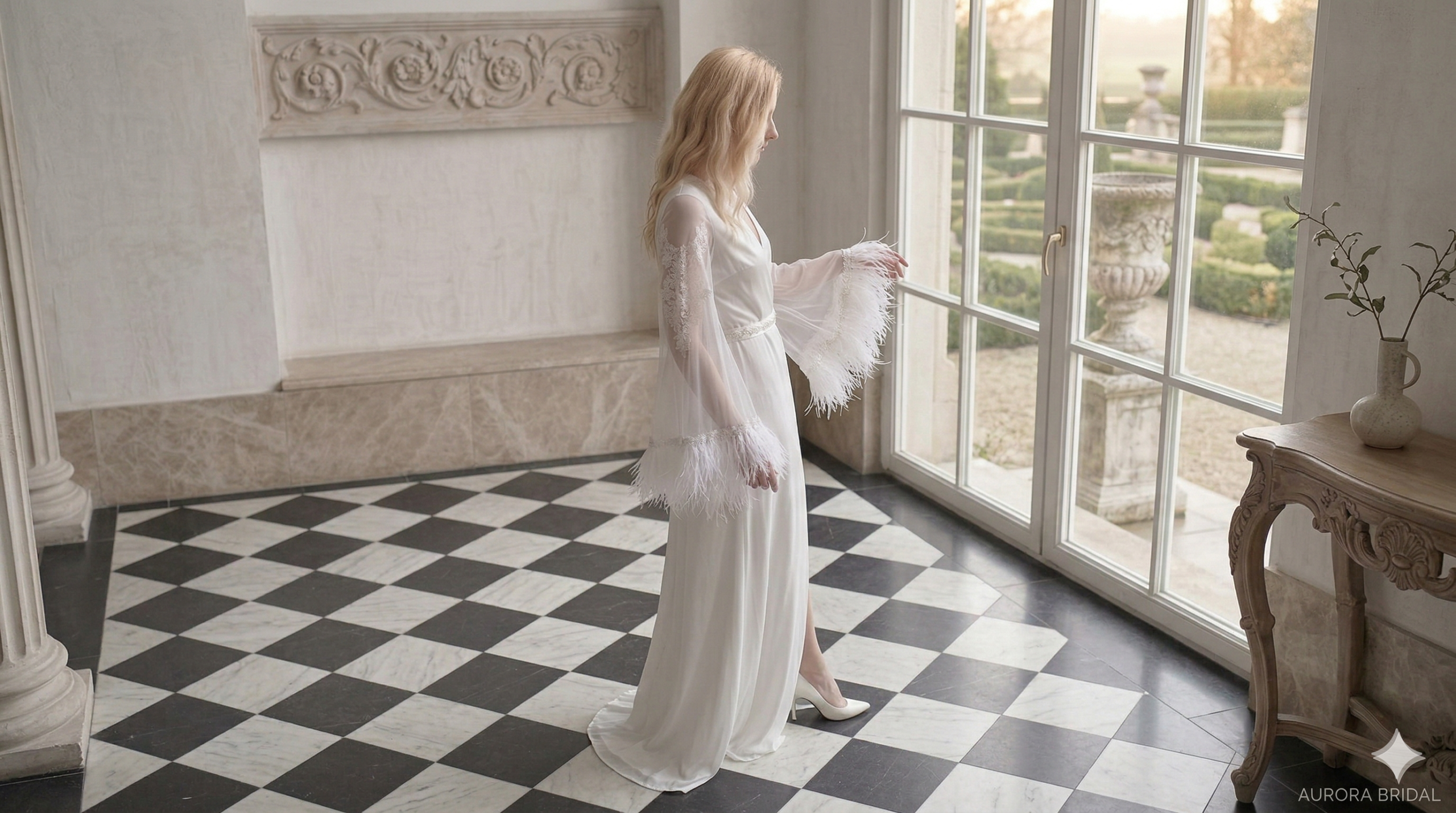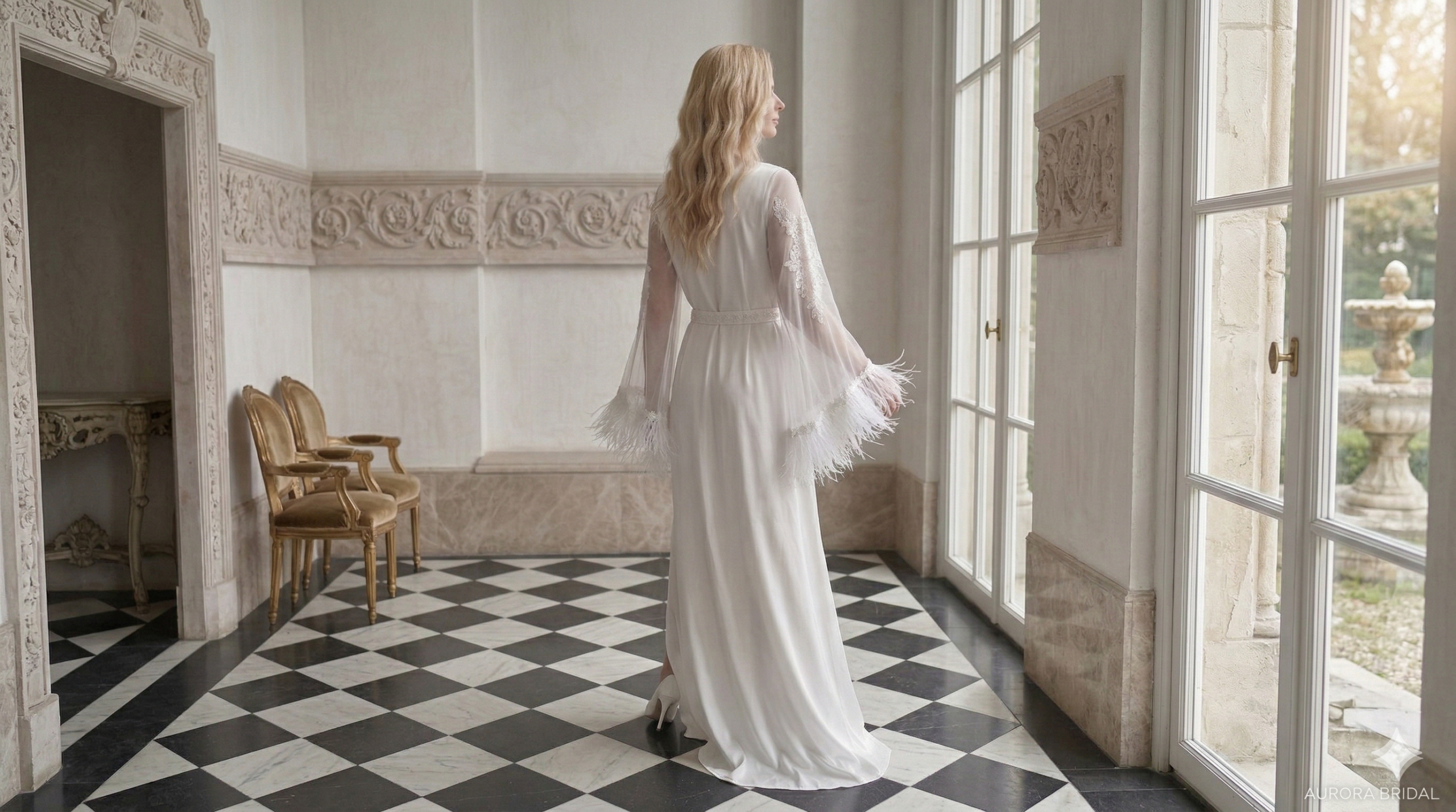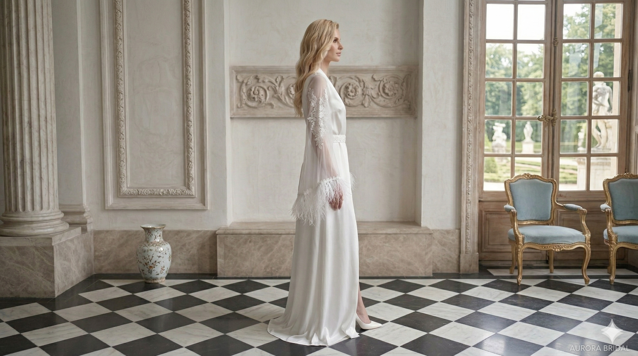 صُمم Aurora Robe للعروس التي تبحث عن مزيج من الأناقة الهادئة والتفاصيل المميزة، حيث ينساب الساتان بنعومة على القامة بينما تضيف الأكمام الشفافة المائلة حضورًا راقيًا وخفيفًا يلفت النظر بأسلوب ناعم وفخم.