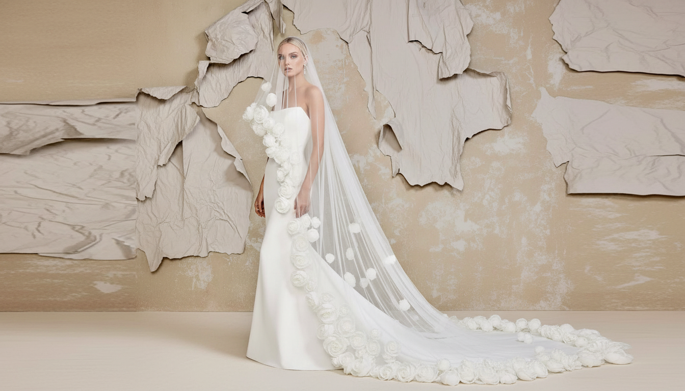طرحة عروس طويلة بتصميم كوتور فاخر من التول الشفاف الناعم، تتألق بتفاصيل ورود ثلاثية الأبعاد كبيرة تنساب على امتداد الحواف بأسلوب درامي راقٍ يلفت الأنظار. يمنح هذا التصميم العروس حضورًا استثنائيًا يجمع بين الرومانسية والفخامة، لتتحول الطرحة إلى قطعة رئيسية تكمل إطلالة الزفاف بلمسة فنية مترفة لا تُنسى.