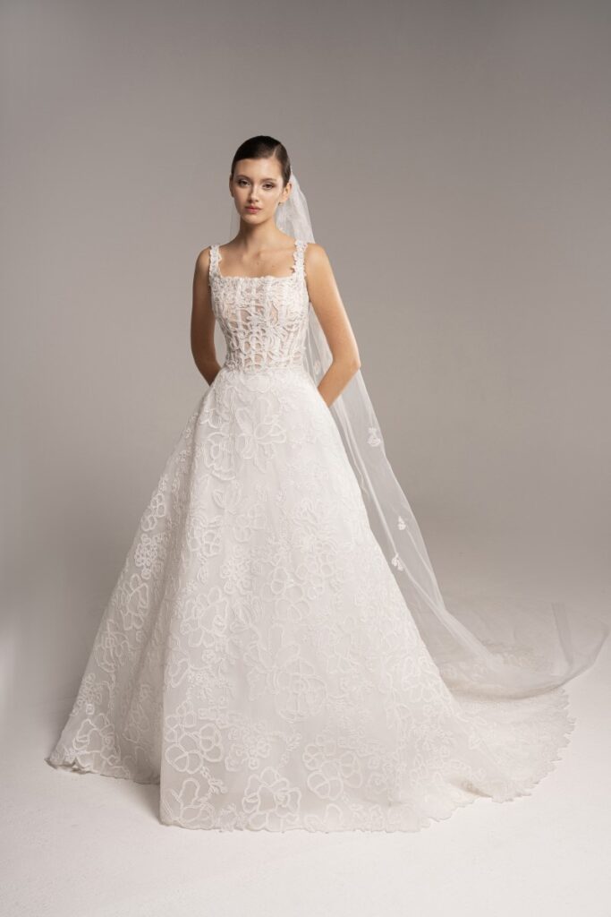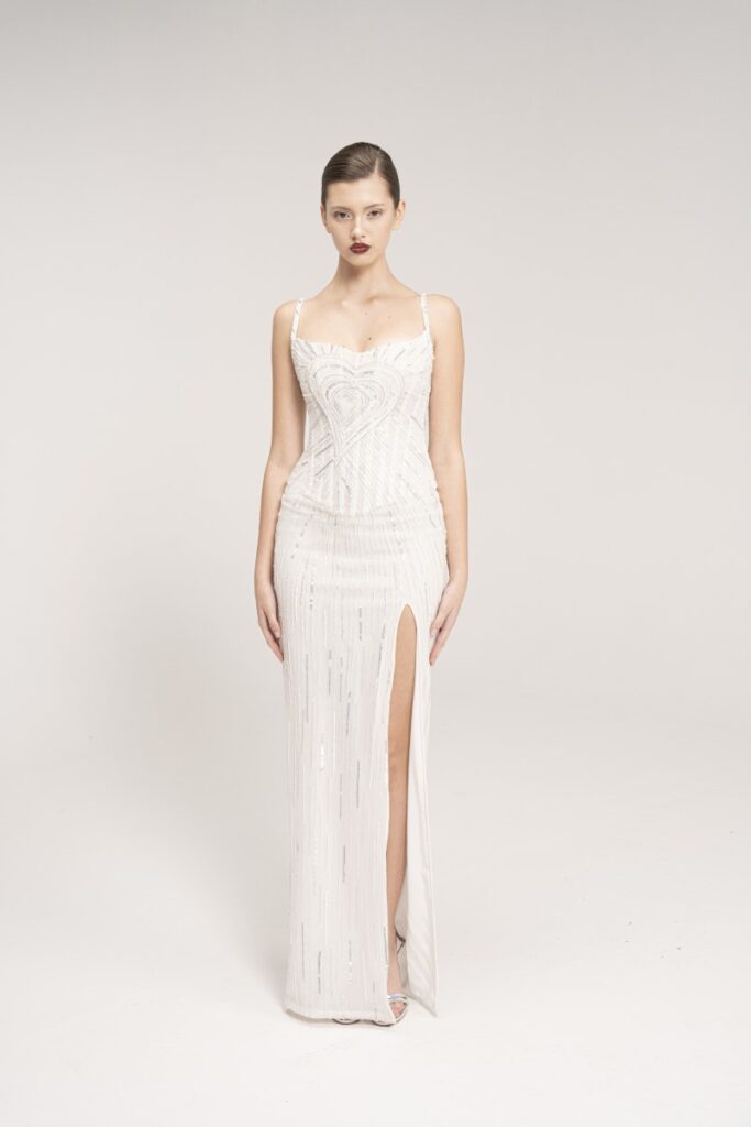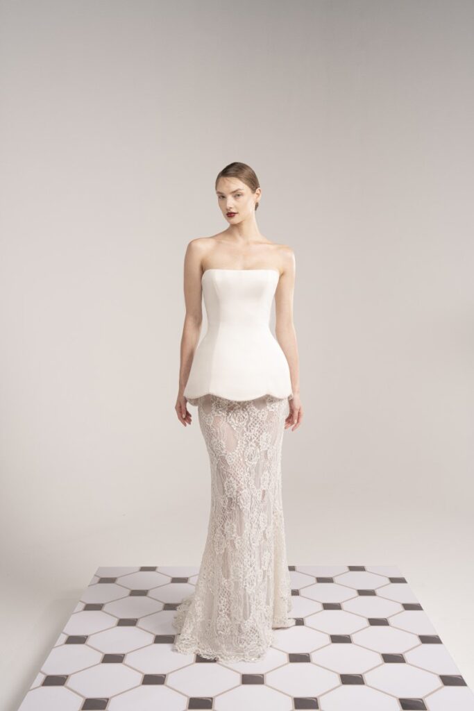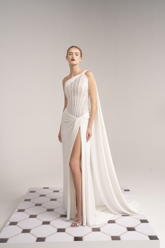- فستان “البلورة”: فستان ضيق بالكامل (Mermaid) مغطى بقطع صغيرة من المرايا والكريستال الهندسي، يعطي إيحاءً بأن العروس مرتدية قطعة من الألماس الخام.