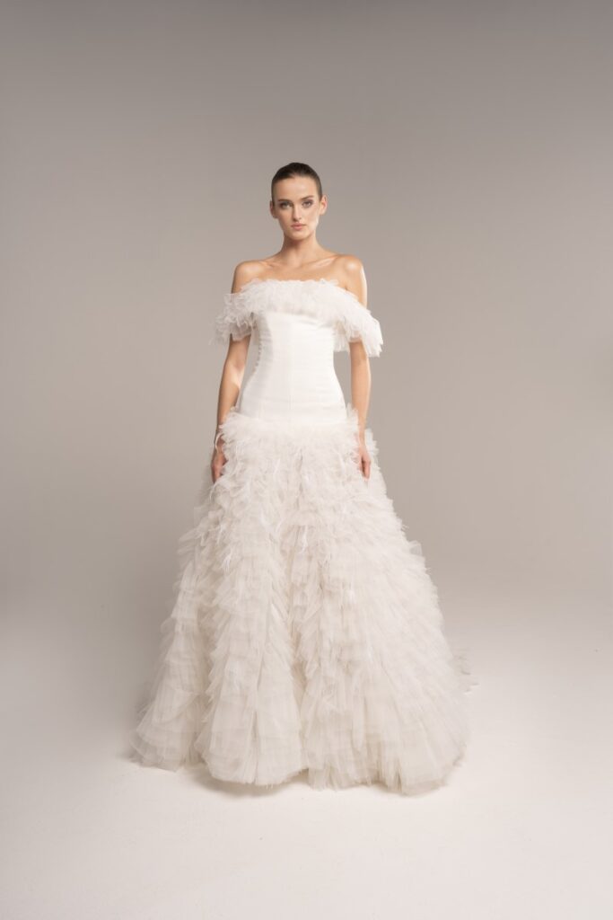 - إطلالة “الأجنحة”: فستان واسع يتميز بأكمام ضخمة من الريش الأبيض الممتد، يعطي مظهراً ملائكياً عصرياً بعيداً عن الكلاسيكية.