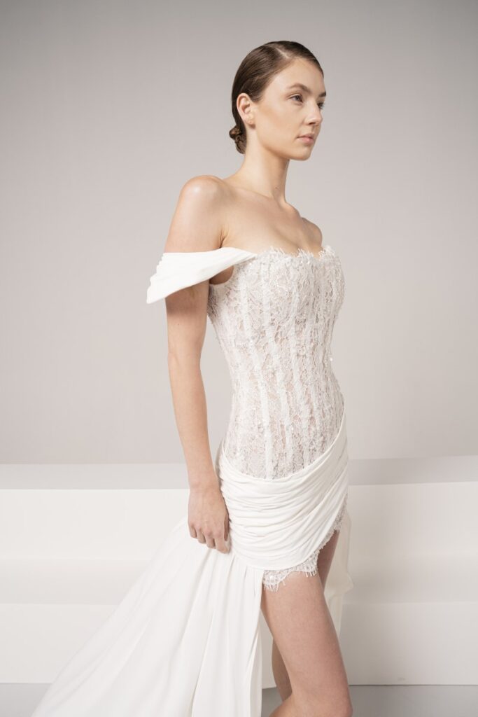 - فستان “المستقبل”: فستان قصير من الأمام بتطريزات ليزرية دقيقة، مع تنورة إضافية ضخمة جداً (Over-skirt) من الستان الملكي الجامد.