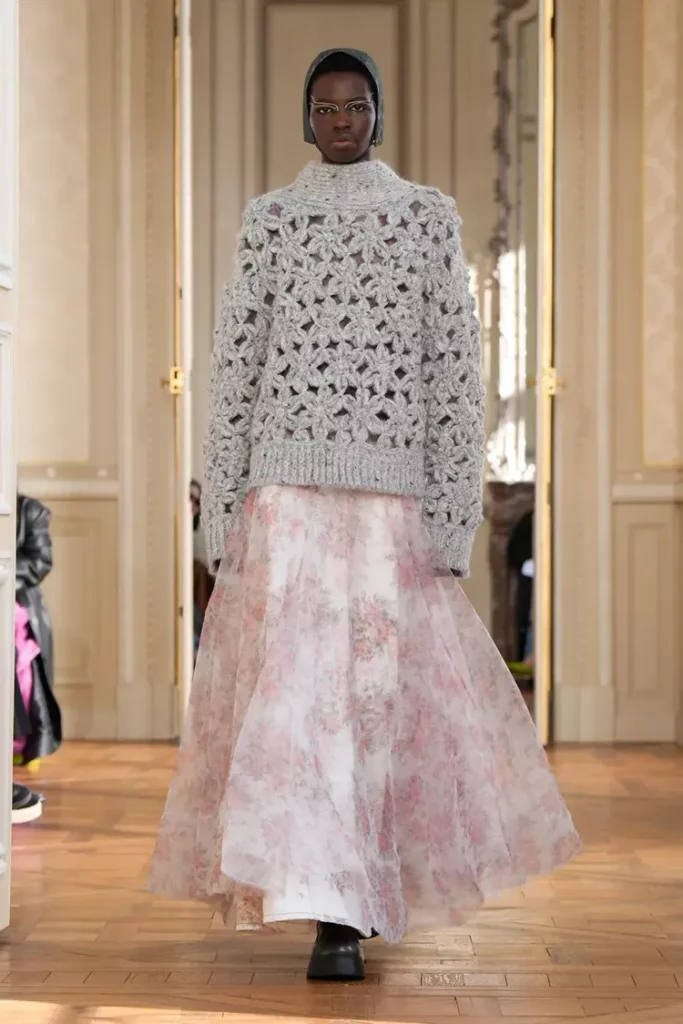 - عودة “الكارديغان” الجرونج (Neo-Grunge Knits): التريكو في 2026 ليس كلاسيكياً. نتحدث عن كنزات صوفية واسعة (Oversized) مع تفاصيل ممزقة عمداً، أو ألوان متضاربة (مثل الأخضر النيون مع البني)، لترتديها فوق فستان حريري ناعم.