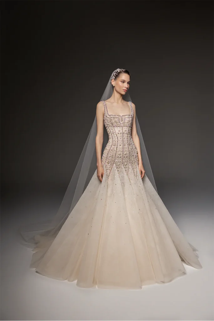 • التصميم والقصة: يقدم هذا التصميم مفهوم “الفستان المتحول” من خلال قصة مستقيمة مزينة بـ زهور ثلاثية الأبعاد (3D Florals)، مرفقة بـ تنورة إضافية (Overskirt) تمنح العروس طلّة ملكية مهيبة.