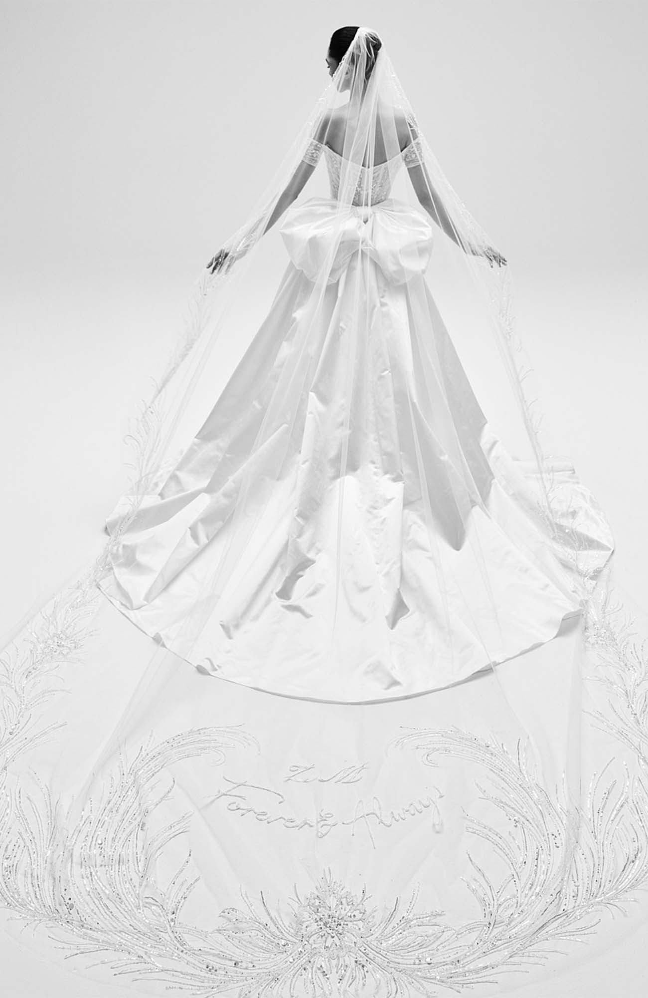 ساتان الدوقة مُنحت بدقة متناهية ليُزيّن ياقات القلب الفاخرة، ثم ينساب بحرية ليُشكّل تصميمًا مهيبًا. تطريز الكريستال يُبرز نفسه – مُنتشر في أماكن، وكثيف في أماكن أخرى – مُستحضرًا بريقًا مُشرقًا في كل مكان.